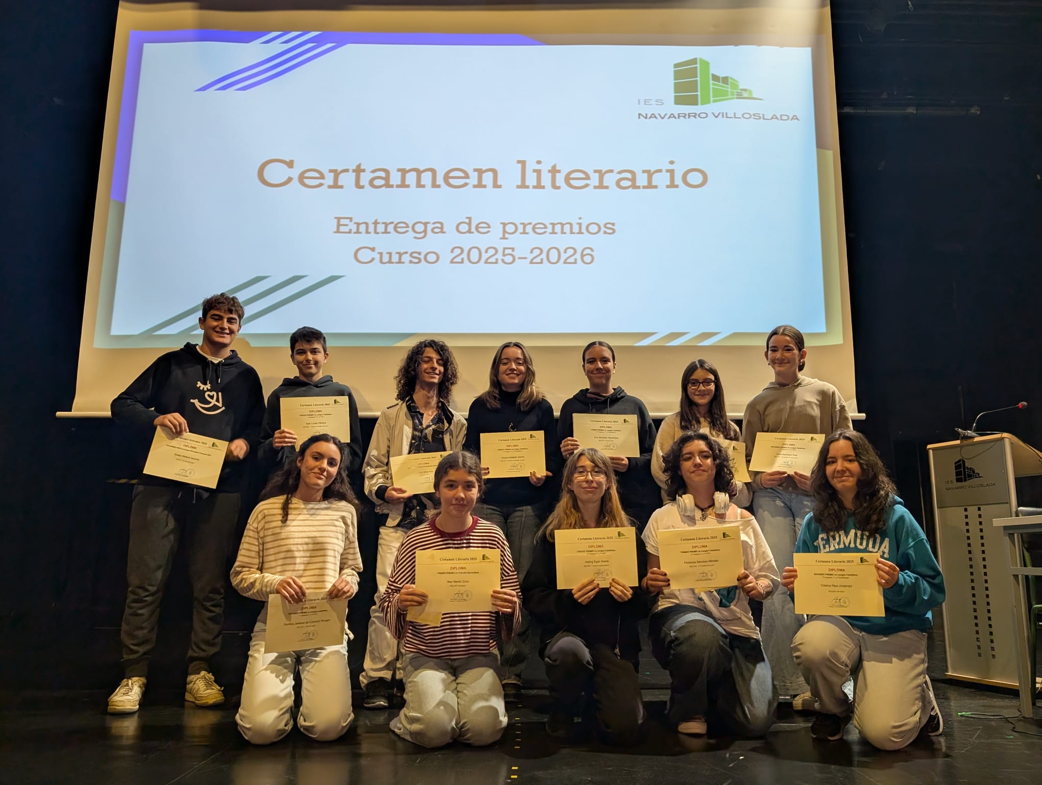 Iván Lorea Climent (1º D), Lena Berthelot Ruiz (1º A), Laia Echarri Sánchez (1º C), Eneko Albéniz Ibarrola (4º A), Noa Martín Zoco (2º A), Kateryna Klepach (3º A), Aisling Egan Arana(4º B), Carolina Jiménez de Cisneros Peragón (3ºA), Florencia Sánchez Méndez (4º A), Andrés Miral Díaz (2º BTO E), Ariane Arizaleta García (2º BTO D), Cristina Ripa Urzainqui (1º BTO A) y Eva Sánchez Hernández (2º BTO A).