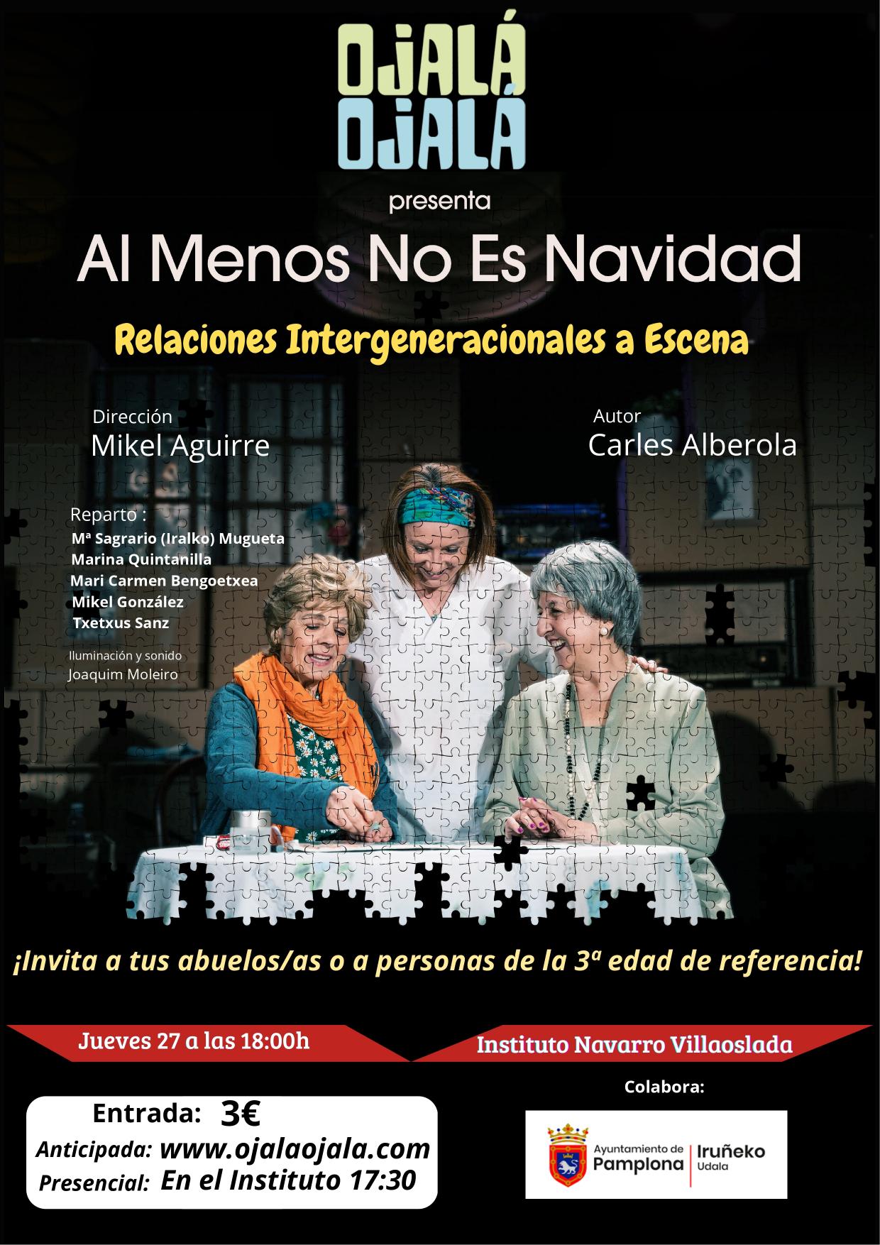 El próximo jueves 27 se representará en el Salón de actos del Navarro Villoslada la obra de teatro Al menos no es Navidad, un espectáculo de Ojalá Ojalá, colectivo sin ánimo de lucro dedicado a intentar transformar realidades a través de las artes escénicas. Esta actividad pretende promover las “relaciones intergeneracionales” provocando la presencia de jóvenes (alumnos/as de secundaria y bachiller) y personas mayores de referencia, nietos/as y abuelas/os, madres/padres, tías/tíos… en un mismo espacio escénico para compartir juntos un espectáculo teatral en el que las protagonistas son dos mujeres mayores que están en una residencia. Al finalizar la actuación, se hará entrega de una guía de sensibilización con la intención de provocar conversaciones y actividades intergeneracionales.